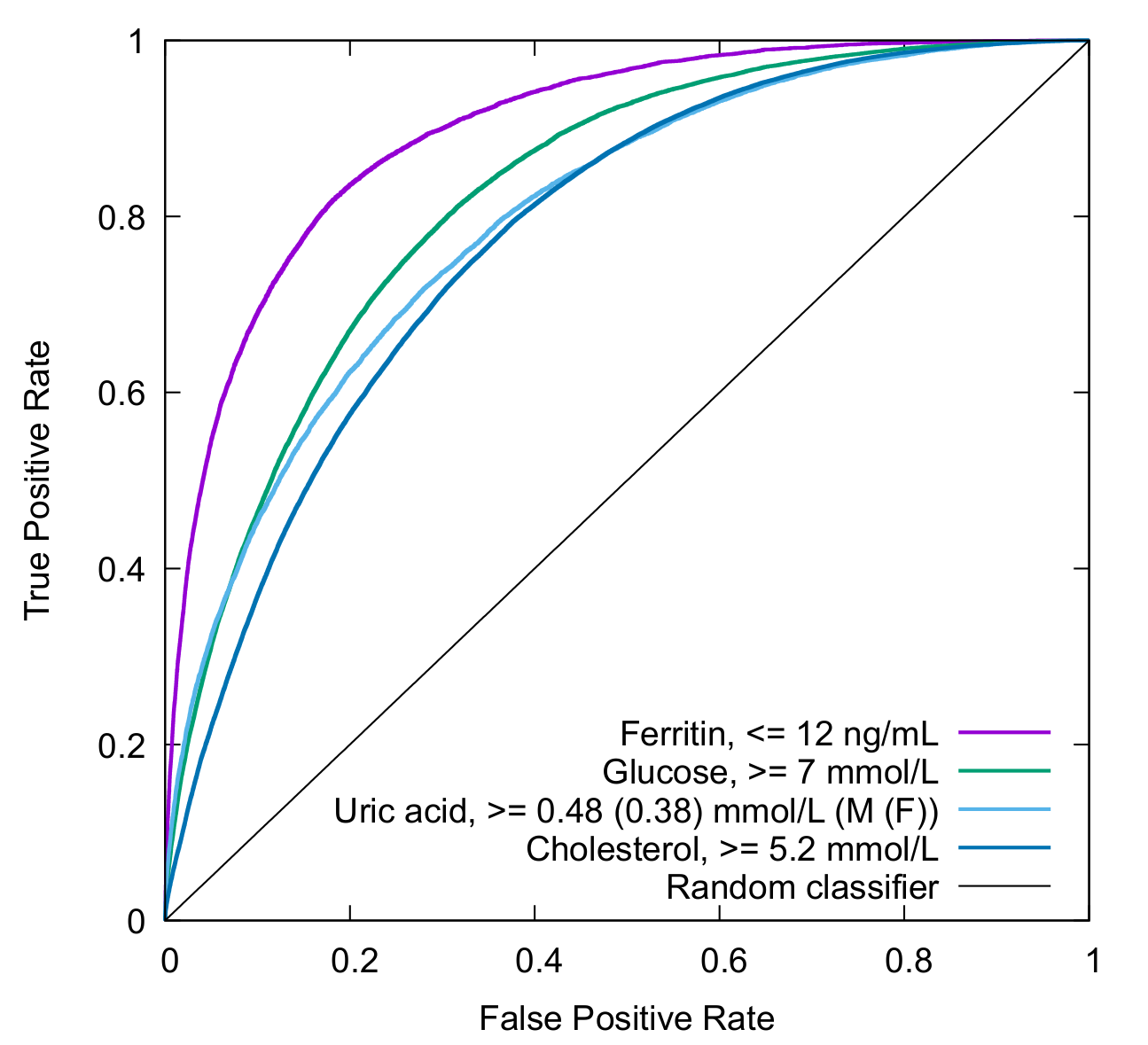 This model has internal index 1 and make a prognosis of low ferritin levels, < 12 μg/L (Some laboratories may use ng/mL as units, ng/mL = μg/L). It is a shallow network calculating a probability of low levels of ferritin for provided data. The statistics of the model is: